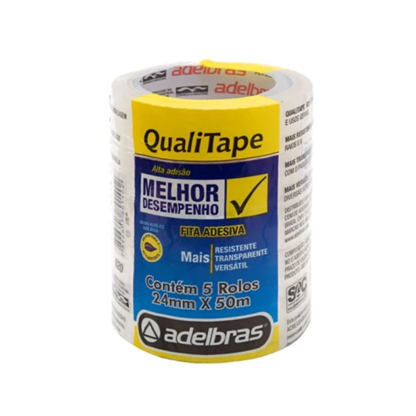 Fita Adesiva transparente 24mm x 50m Qualitape Adelbras é uma fita adesiva transparente de uso geral, conhecida por sua versatilidade e qualidade.