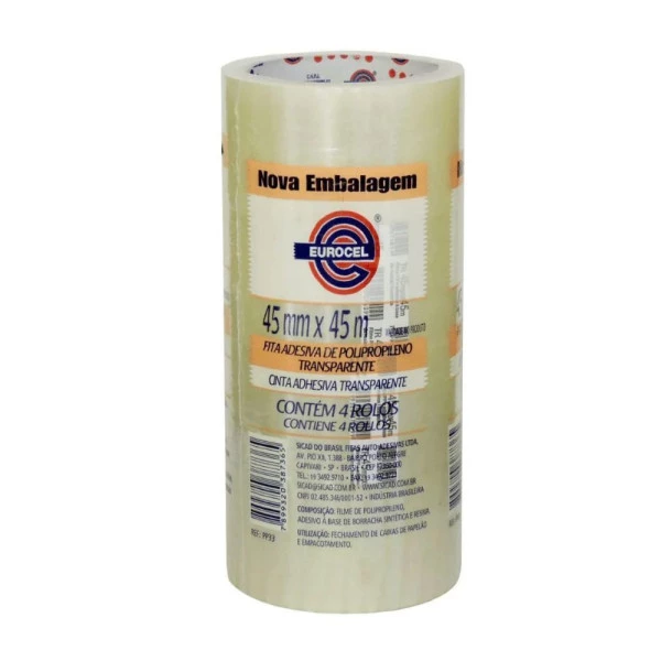 Fita adesiva transparente 45mmx45m EURO PP33 eurocel. É ideal para selar caixas, pacotes e outros materiais de embalagem. É conhecida por sua resistência e durabilidade, garantindo uma aderência forte e segura para manter os pacotes fechados durante o transporte e armazenamento. Características
