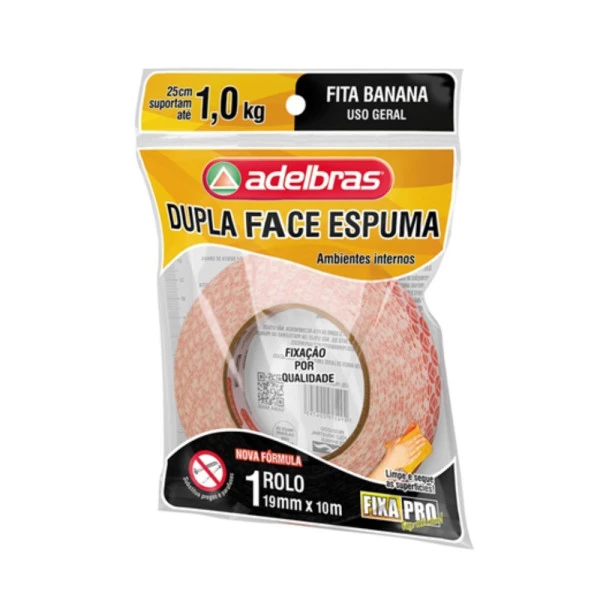 Fita Banana Dupla Face Espuma 19mmx10m Fixa Pro 941 adelbras. É uma fita adesiva versátil e eficiente, ideal para fixações permanentes. Espuma de polietileno com espessura de 1,0mm e adesivo acrílico solvente em ambos os lados.
