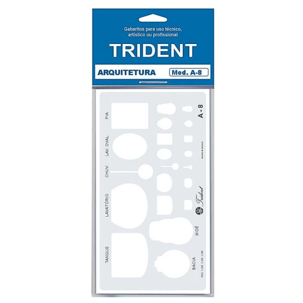Gabarito arquitetura Sanitários A-8 Trident é feito em astralon verde de 0,75mm de espessura. Com Moderna linha de gabaritos, contendo as principais peças para sanitários., em três escalas. Dimensões: 14 x 7,5 cm. Escala: 1:20 | 1:50