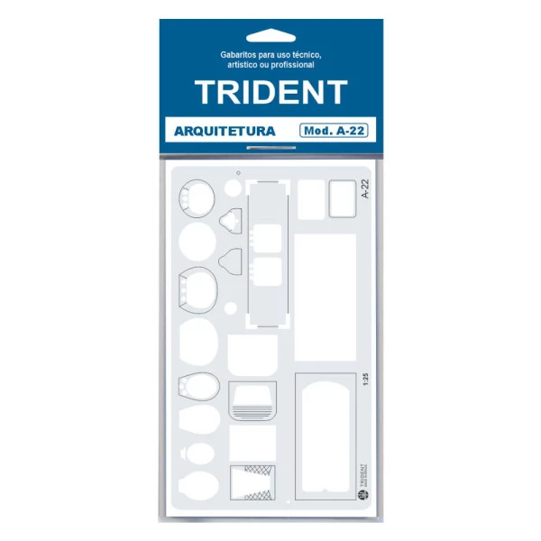 Gabarito arquitetura Sanitários A-22 Trident é feito em astralon verde de 0,75mm de espessura. Com Moderna gabarito, de peças sanitárias, com perfis externos e internos. Dimensões: 19 x 11cm. Escala: 1:25 Características