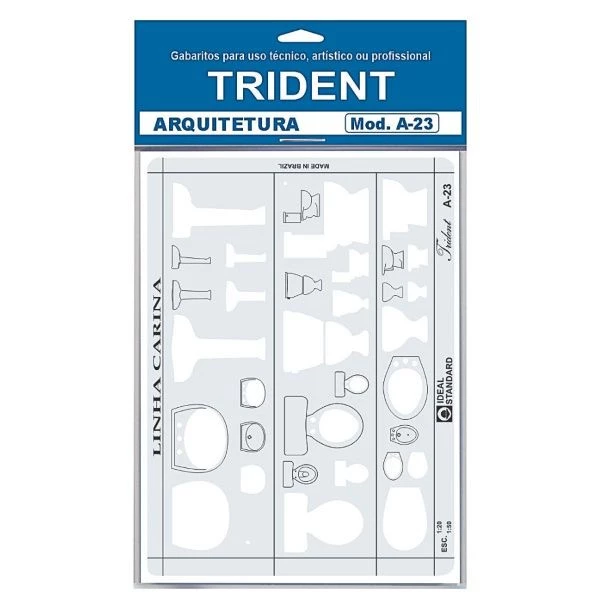 Gabarito Arquitetura Sanitários A-23 Trident é feito em astralon verde de 0,75mm de espessura. Com perfis vistos de cima, de frente, e de lado, em duas escalas. Dimensões: 17,5 x 13 cm. Escala: 1:20 e 1:50 Características