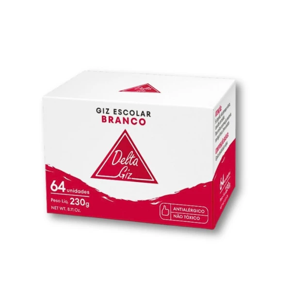 Giz Escolar Comum Branco 64und 230g Delta, é antialérgico, ideal para uso por professores e alunos. Características
