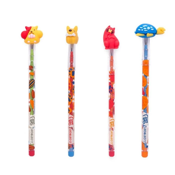 Apresenta quatro modelos encantadores, cada um com um personagem de animal diferente: gato, cachorro, castor e tartaruga. Com personagens super fofos, tornando a experiência de usar a lapiseira mais divertida e atraente.