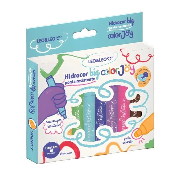 Hidrocor 10 cores big color joy Leo&Leo. Hidrocor Big com ponta redonda super resistente, que não afunda quando pressionada contra uma superfície., permitindo que a criança tenha um controle mais preciso sobre o traço.
