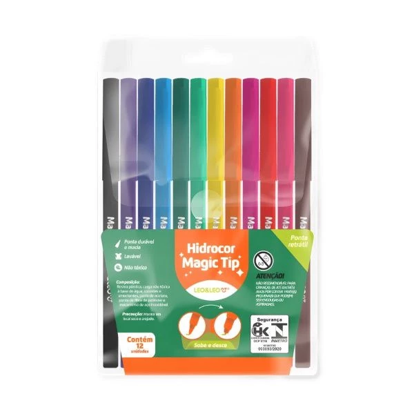 O Hidrocor Magic Tip Leonora traz praticidade e diversão para o dia a dia escolar. Com 12 cores vivas, ele possui a exclusiva ponta “Sobe e Desce”, que permite recolher e proteger a ponta sem precisar de tampa, evitando sujeira, ressecamento e perdas.