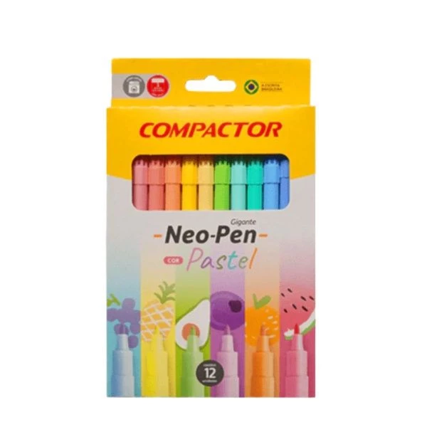 Caneta Hidrográfica 12 Cores Pastel Neo-Pen Gigante Compactor. Sua ponta é resistente, com tinta à base de água, super lavável. Características