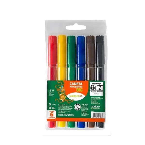 Caneta Hidrográfica 6 Cores Big Jumbo Leo&Leo. Hidrocor 6 cores vibrantes, tem formato oitavado, no tamanho jumbo big. São perfeitos para as mãozinhas dos artísticas pequenos facilitando a pegada e o encaixe, tornando as atividades criativas e de colorir mais divertida. Características