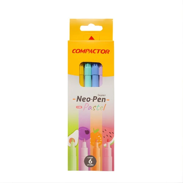 O Hidrocor Fino Neo Pen Pastel Gigante da Compactor conta com 6 cores delicadas em tons pastel, ideal para lettering, desenhos, marcações suaves e projetos criativos. Sua ponta fina oferece traços precisos e suaves, proporcionando excelente controle e acabamento elegante.