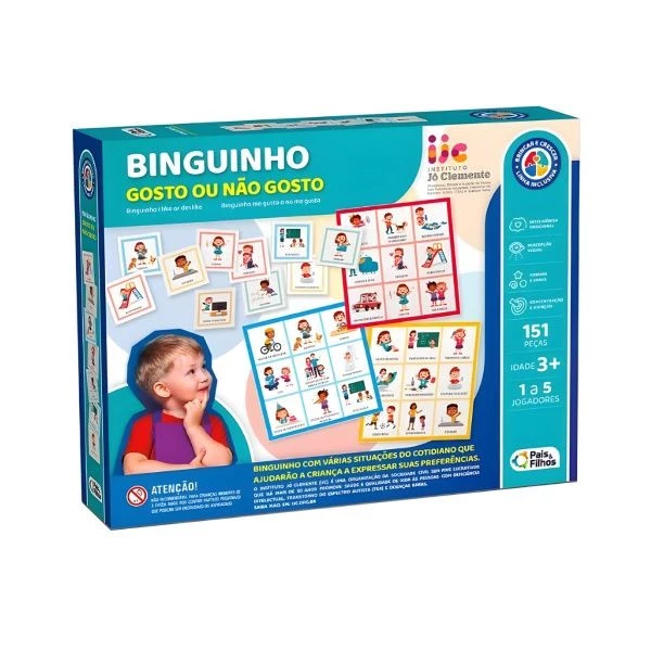 Jogo Bingo Gosto ou Não Gosto da linha inclusiva da Pais e Filhos é um jogo educativo que promove a expressão de preferências pessoais das crianças de maneira lúdica e inclusiva.