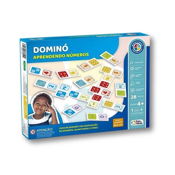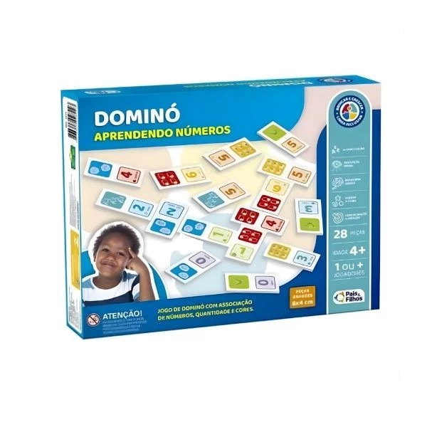 Jogo de Dominó Aprendendo Números da linha inclusiva da Pais e Filhos, é um jogo educativo que combina o tradicional do dominó com o aprendizado de associação de números, quantidades e cores.