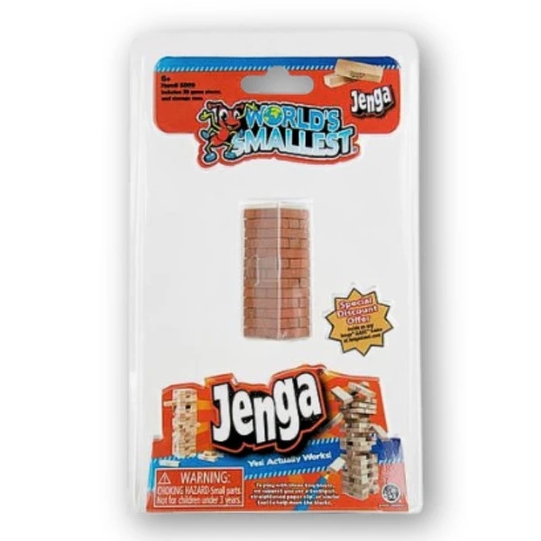 Jenga é um clássico jogo de blocos, agora em minuatura. Com menos de 6,35 cm de altura e 39 miniblocos, essa versão em plástico.