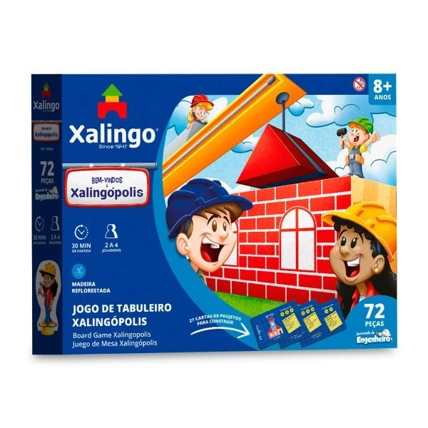O Jogo de Tabuleiro Xalingópolis da Xalingo o jogador deve montar, com suas peças, a construção descrita em uma de suas cartas de Projeto. Desafia a criança a construir sua própria cidade.