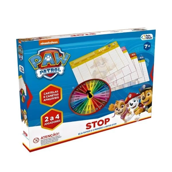 Jogo Stop Patrulha Canina da Pais e Filhos, é um jogo dinâmico e divertido onde os jogadores devem ser rápidos para gritar "stop" e completar desafios baseados na famosa série "Patrulha Canina".