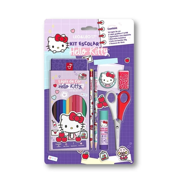 Kit Escolar da Hello Kitty Leo&Leo, vem com estampa da personagem mais fofa Hello Kitty. Acompanha Lápis de cor 12 cores sextavado, 02 Lápis HB sextavado, 01 Apontador com depósito, 01 Borracha com formato, 01 Cola bastão de 10 g e 01 Tesoura de 13 cm. Características