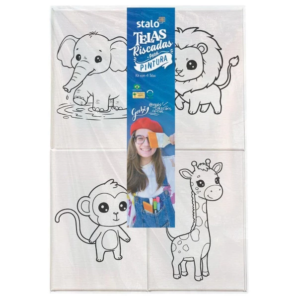 Desperte a criatividade e a imaginação das crianças com o Kit Telas de Pintura Riscadas Gabi Calazans África Stalo! Com ilustrações encantadoras de animais da savana - elefante, leão, macaco e girafa . O kit oferece uma experiência divertida e educativa para pequenos artistas a partir de 3 anos.