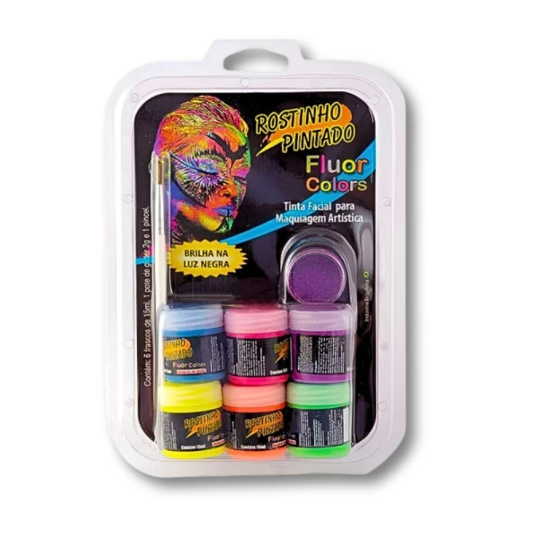 Tinta Facial 6 Cores Neon Fluorescente + 1 Glitter da Rostinho Pintado. Kit com 6 cores fluorescente de tinta facial para maquiagem artística Flúor Colors, que brilha na luz negra. Acompanha 01 pincel mais 01 Glitter.
