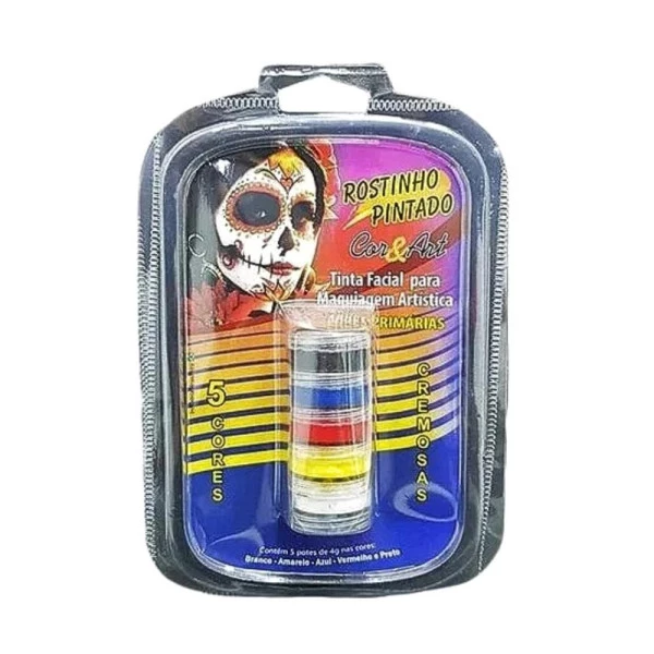 Kit tinta facial cremosa 5 cores de 4g Cor & Art da Rostinho Pintado. É um kit de tinta cremosa artística a base de óleos e ceras, com cheiro de tutti-frutti. Ideal para maquiagem corporal e facil. Características