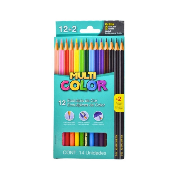 Lápis de Cor Multicolor 12 Cores tem formato sextavado para facilitar a pegada, cores fortes e vibrantes, e ponta resistente fácil de apontar.