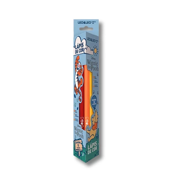Lápis de Cor 12 Cores Ursinho Pooh da Leo&Leo, acompanha 12 lápis com formato triangular e cores vibrantes. Sua embalagem é inspirada no Winnie the Pooh, dando gostinho de mel. Ideal para estimular a imaginação das crianças nas atividades de desenho e escolar. Características