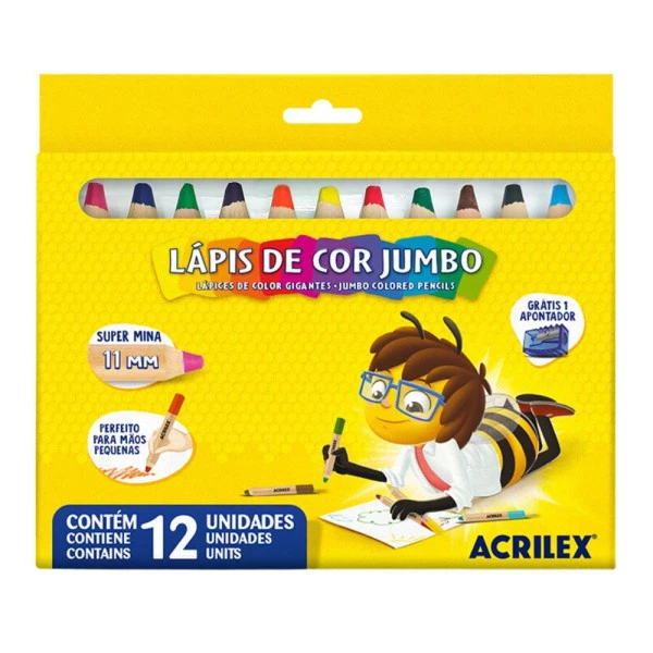Lápis de cor Jumbo 12 cores da acrilex, possui super mina 11mm com traço macio e suave. Seu formato anatômico perfeitos para mãos pequenas. Características