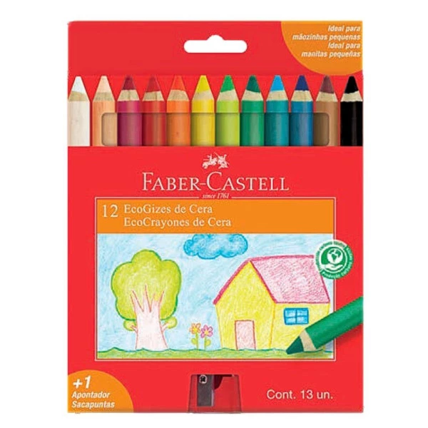 Lapis Giz de Cera Ecogizes 12 Cores Faber Castell com Apontador Grande, possui corpo em madeira formato redondo, com espaço para nome da criança. Características