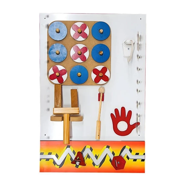 Painel com atividades táteis e cores variadas