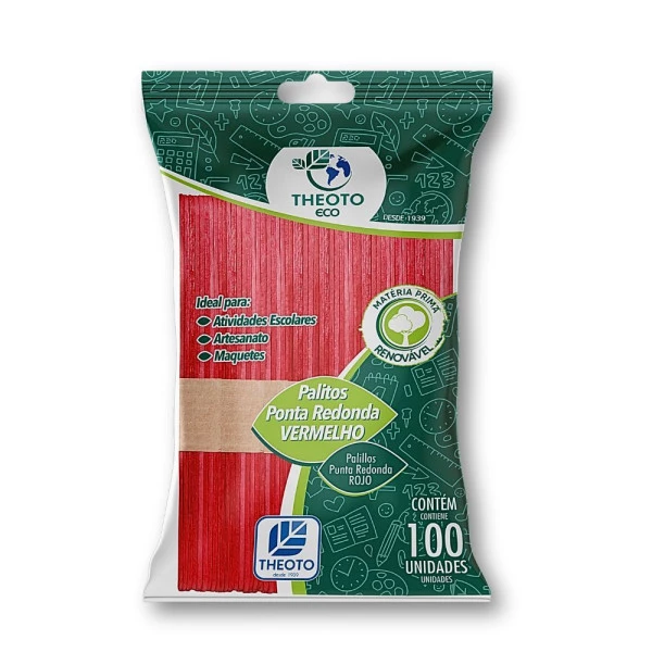 Palito Escolar Ponta Redonda Vermelho de Picole pct/100 Theoto, são indicados para uso em trabalhos escolares, Auxiliando no desenvolvimento da criatividade das crianças.