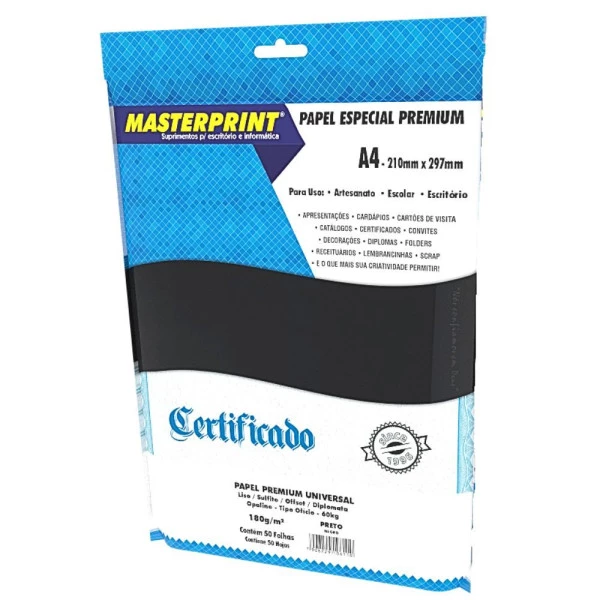 Papel especial premium com acabamento fosco e cor preta intensa, ideal para impressoras jato de tinta e laser. Com gramatura de 180g/m², é perfeito para trabalhos criativos e personalizados como convites, cartões, certificados, lembrancinhas, folhetos, cardápios e peças de artesanato. Tamanho A4 (210 x 297mm).