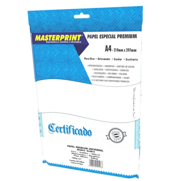 Papel especial premium com acabamento fosco e cor branco, ideal para impressoras jato de tinta e laser. Com gramatura de 180g/m², é perfeito para trabalhos criativos e personalizados como convites, cartões, certificados, lembrancinhas, folhetos, cardápios e peças de artesanato. Tamanho A4 (210 x 297mm).