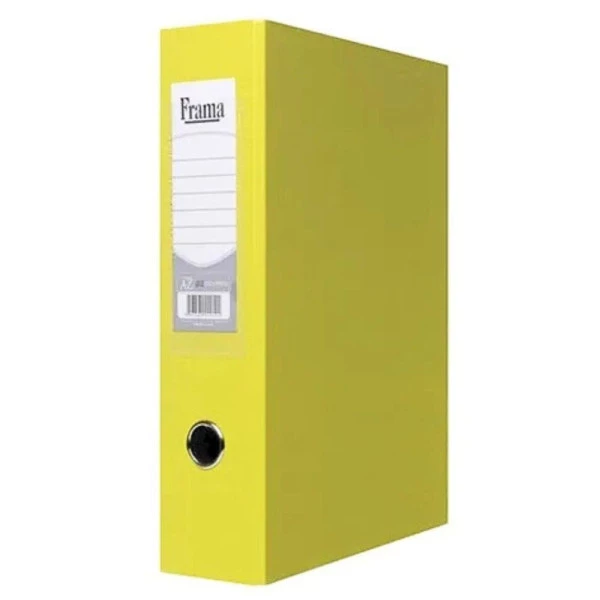 Pasta AZ Ofício Lombo Largo Frama, cor amarela, com revestimento externo em papel plastificado e olhal metálico. Possui papeletas maiores, oferecendo mais espaço para identificação. Ideal para arquivamento e organização de documentos. Características