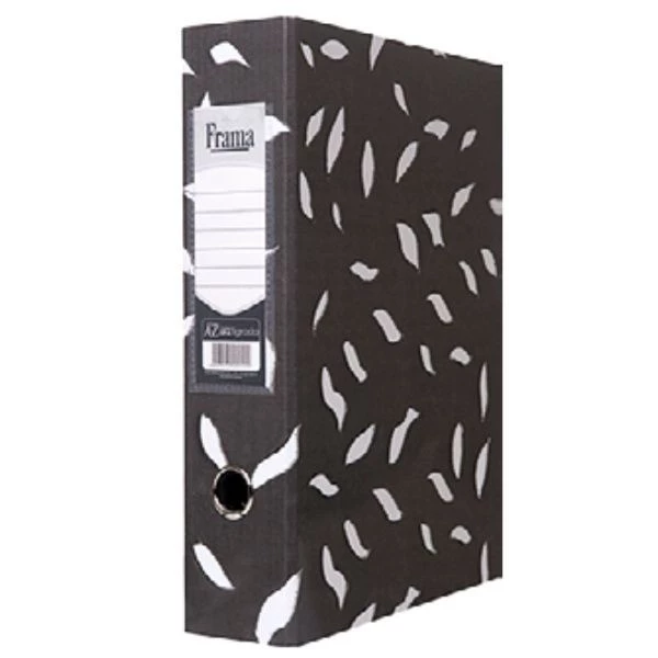 Pasta AZ Ofício Lombo Largo Frama, cor tigrado, com revestimento externo em papel plastificado e olhal metálico. Possui papeletas maiores, oferecendo mais espaço para identificação. Ideal para arquivamento e organização de documentos. Características
