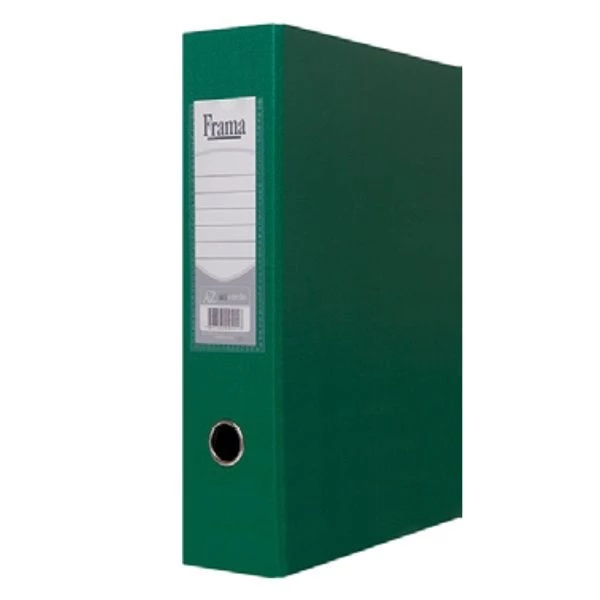Pasta AZ Ofício Lombo Largo Frama, cor verde, com revestimento externo em papel plastificado e olhal metálico. Possui papeletas maiores, oferecendo mais espaço para identificação. Ideal para arquivamento e organização de documentos. Características