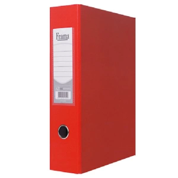 Pasta AZ Ofício Lombo Largo Frama, cor vermelho, com revestimento externo em papel plastificado e olhal metálico. Possui papeletas maiores, oferecendo mais espaço para identificação. Ideal para arquivamento e organização de documentos. Características