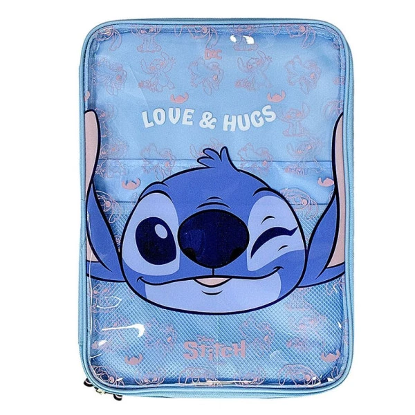 Pasta fichário universiáaria criativa em PVC cristal e verso em Naylon. Ideal para organizar itens do dia a dia como cadernos, celular, notebook 14", com estampa do personagem divertido Stitch.