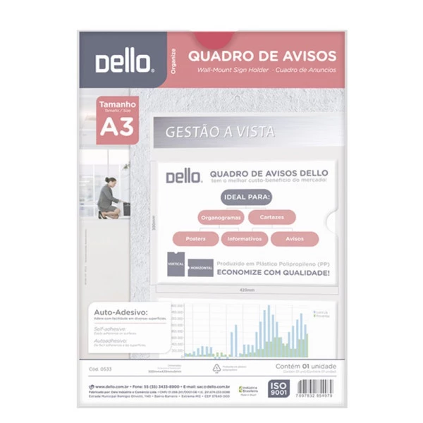 O Quadro de Avisos A3 Multiuso da Dello é uma solução prática e eficaz para a organização e exibição de informações. Seu design transparente e durável garante que os documentos sejam visíveis e protegidos.
