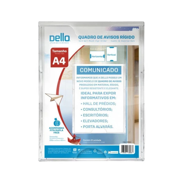 O Quadro de Avisos A4 Rígido Cristal da Dello é uma solução prática e eficaz para a organização e exibição de informações. Seu design transparente e durável garante que os documentos sejam visíveis e protegidos.