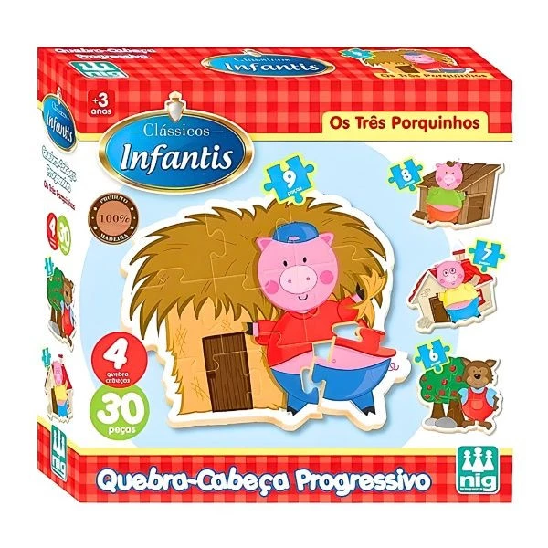Quebra-cabeça progressivo com 30 peças em madeira, formando 4 ilustrações dos Três Porquinhos.
