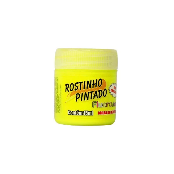 Tinta Liquida facial 15ml Fluor Colors Amarelo da rostinho pintado. É uma tinta facial para maquiagem artística Flúor Colors, que brilha na luz negra. Composição é a base de água, com cheirinho de tutti-frutti, possui secagem rápida. Ideal para pintura facial e corporal. Características
