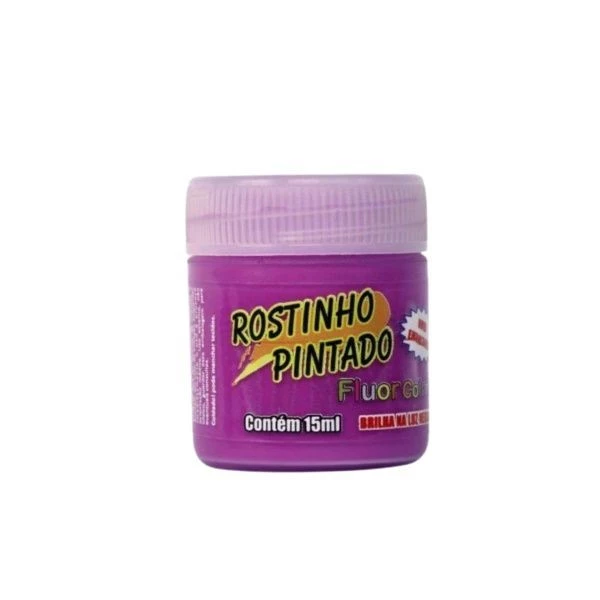 Tinta Liquida facial 15ml Fluor Colors Roxo da rostinho pintado. É uma tinta facial para maquiagem artística Flúor Colors, que brilha na luz negra. Composição é a base de água, com cheirinho de tutti-frutti, possui secagem rápida. Ideal para pintura facial e corporal. Características