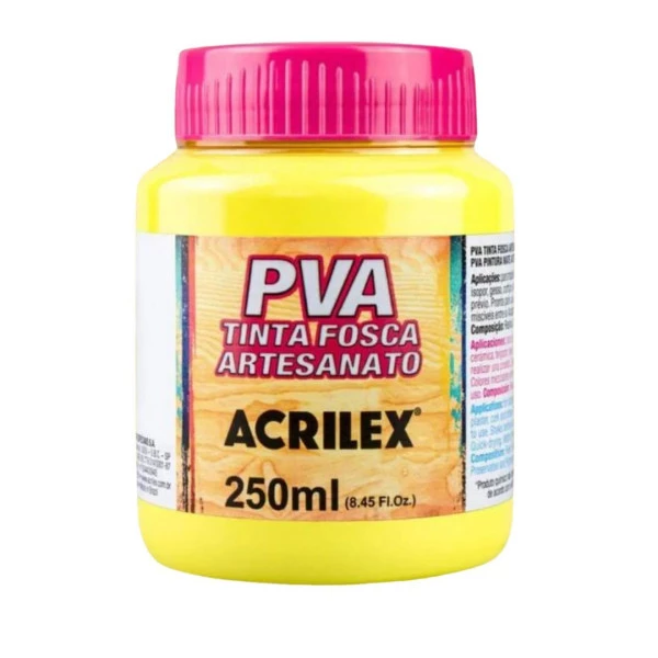 Tinta à base de látex PVA com acabamento fosco e secagem rápida. Indicada para artesanato em madeira, MDF, gesso, cerâmica, biscuit, cortiça, isopor, papel, palha e PET. Fácil de aplicar, com ótima cobertura e aderência. Ideal para trabalhos manuais criativos e personalizados. Características Tinta PVA Fosca Artesanato 250ml Amarelo Limão 504 Acrilex