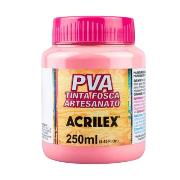 Tinta à base de látex PVA com acabamento fosco e secagem rápida. Indicada para artesanato em madeira, MDF, gesso, cerâmica, biscuit, cortiça, isopor, papel, palha e PET. Fácil de aplicar, com ótima cobertura e aderência. Ideal para trabalhos manuais criativos e personalizados. Características Tinta PVA Fosca Artesanato 250ml Rosa Chá 538 Acrilex